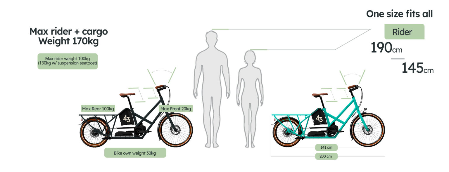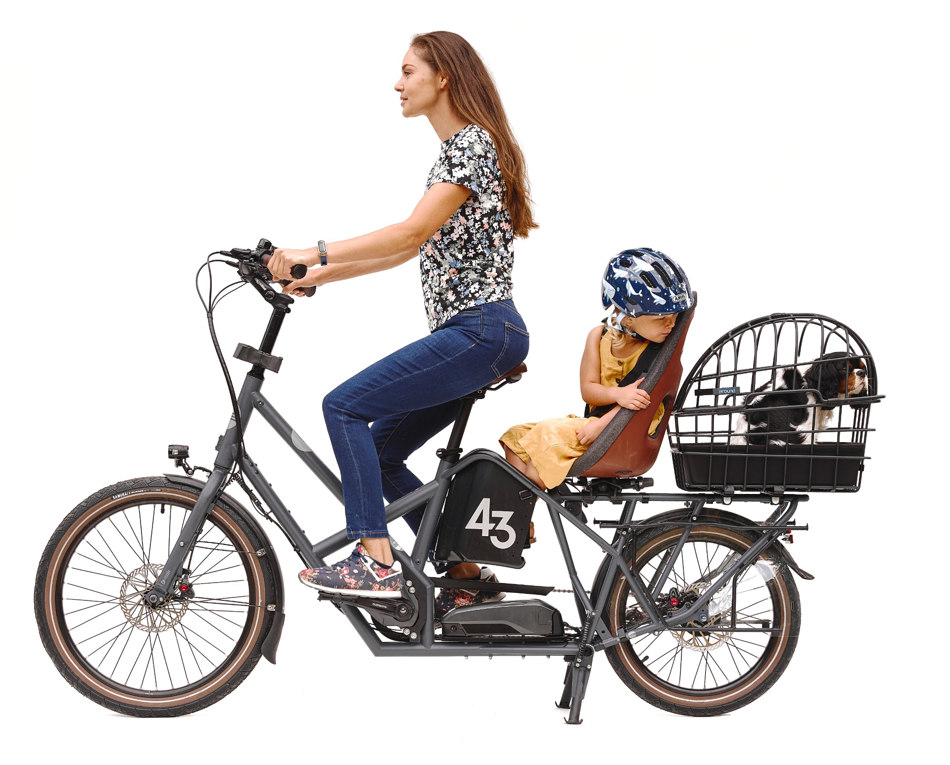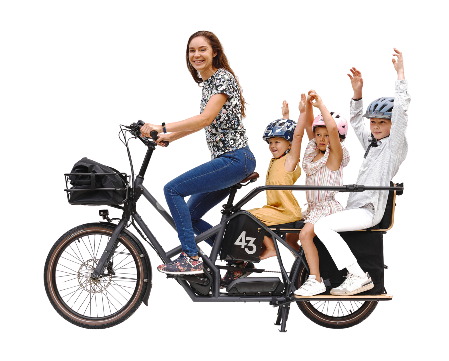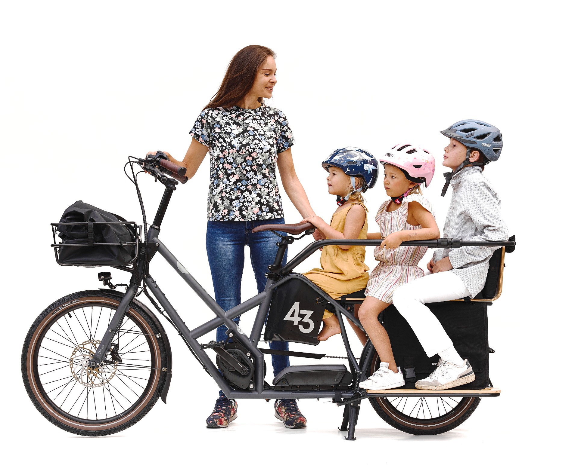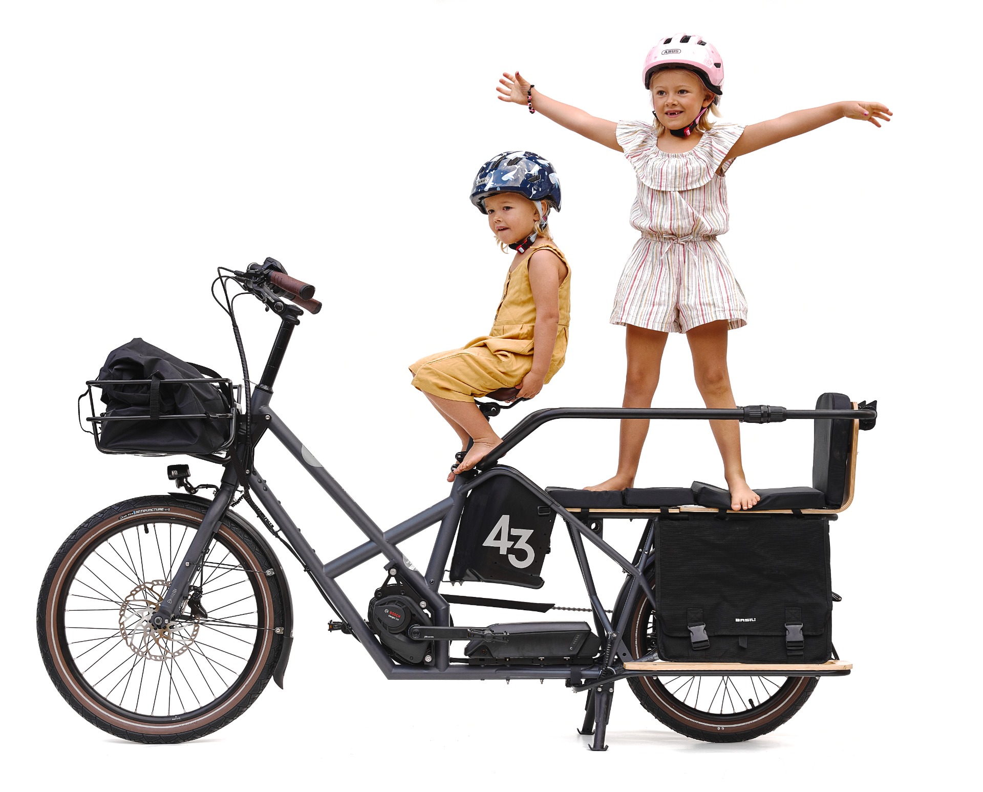 Bike 43 uttalas Bike for 3 och är en smart longtailcykel för familjen. Med en mängd olika tillbehör och 2 olika motoralternativ så kan du själv välja hur du vill konfigurera din cykel.